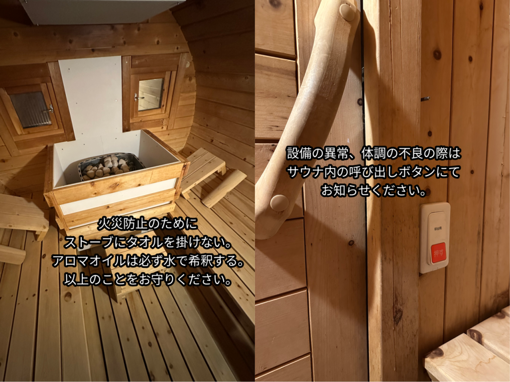 サウナをご利用時にストーブの周りには可燃物を置かないようにお願いいたします。タオルやサウナハット等を近くに置きますと発火する可能性がございます。またロウリュ用のアロマオイルは原液の状態でストーンにかけますと発火します。必ず水で希釈してご... -