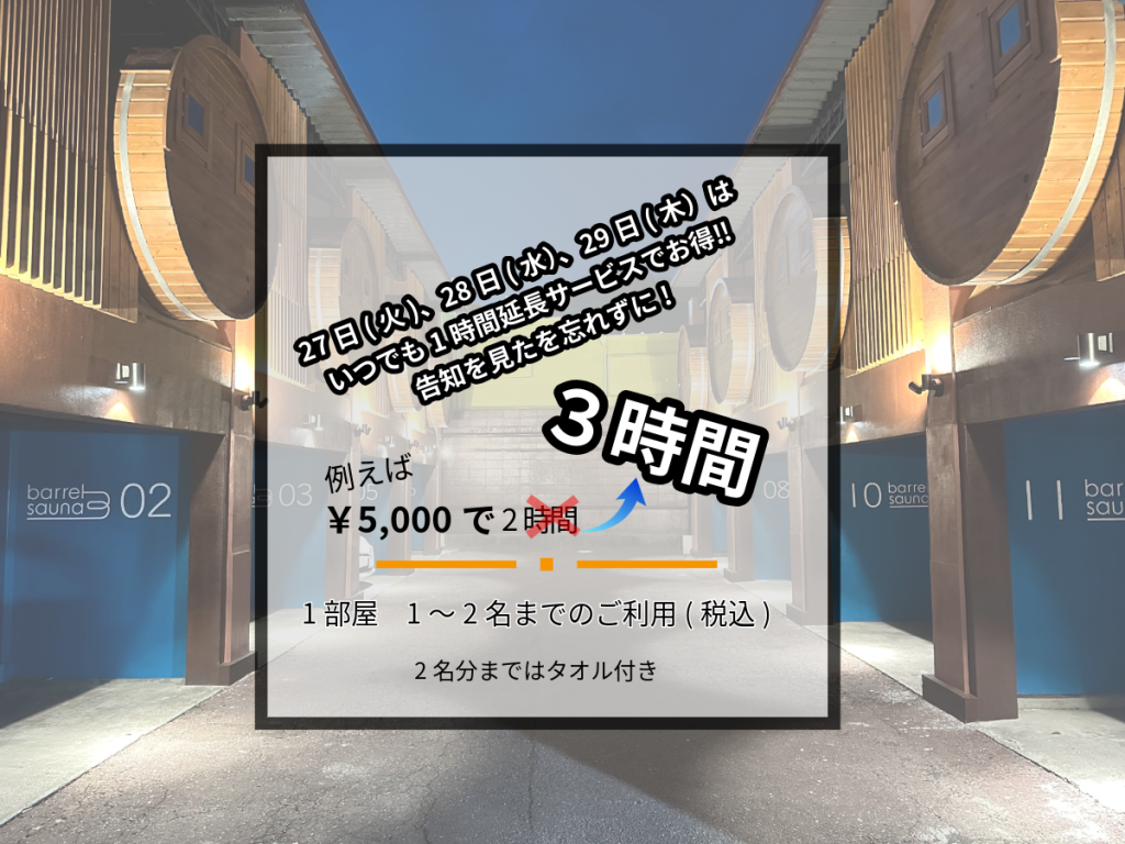 1/27(火)・28(水)・29(木)の3日間!サウナ1時間延長無料サービス開催中!